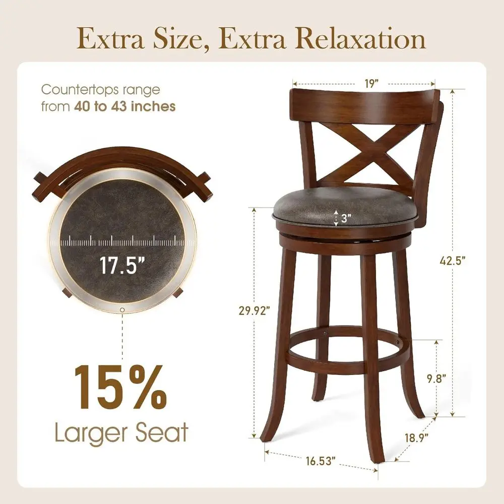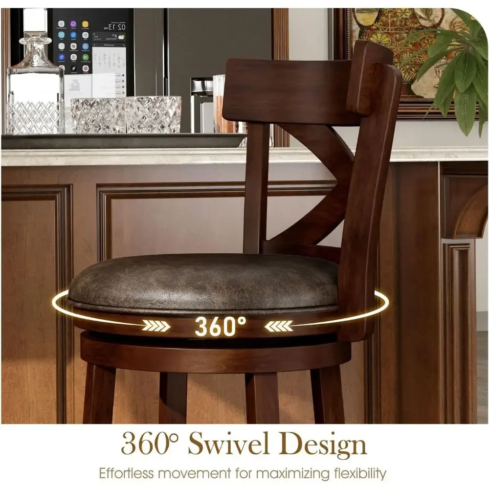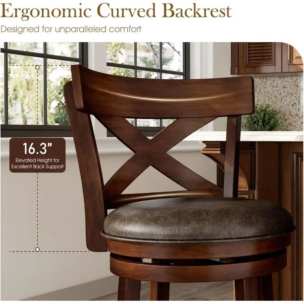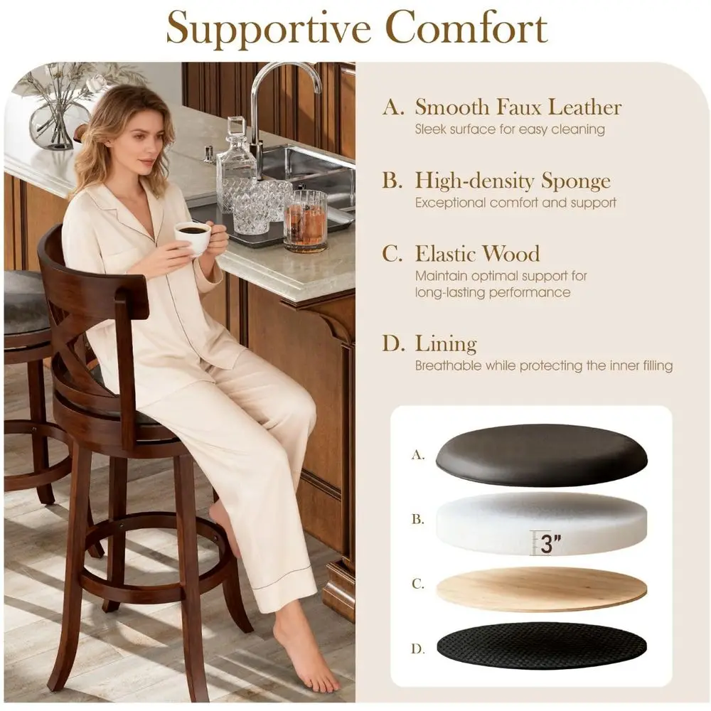 This set of four 30-inch high swivel bar stools combines classic style with everyday comfort. The crossback design adds visual interest while providing reliable back support. Faux leather seats offer a smooth, comfortable sitting surface that is easy to clean. Supported by sturdy walnut-finished legs, these stools deliver durability and stability. The swivel function allows easy movement and flexible seating at bar-height counters. Finished in a warm brown tone, they complement a variety of kitchen and dining décor styles. These bar stools are ideal for home bars, kitchens, and entertainment spaces.