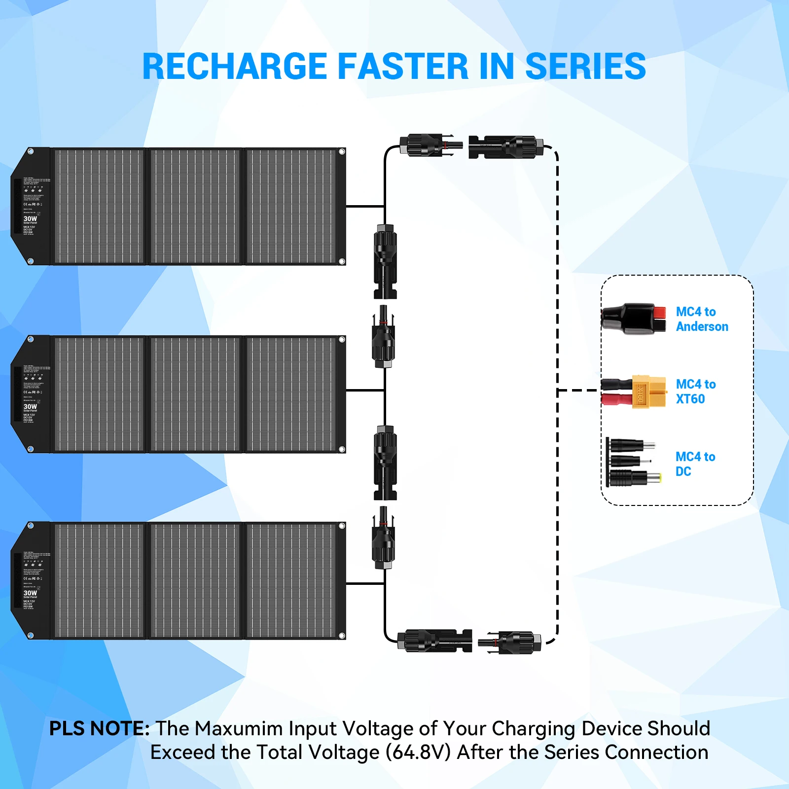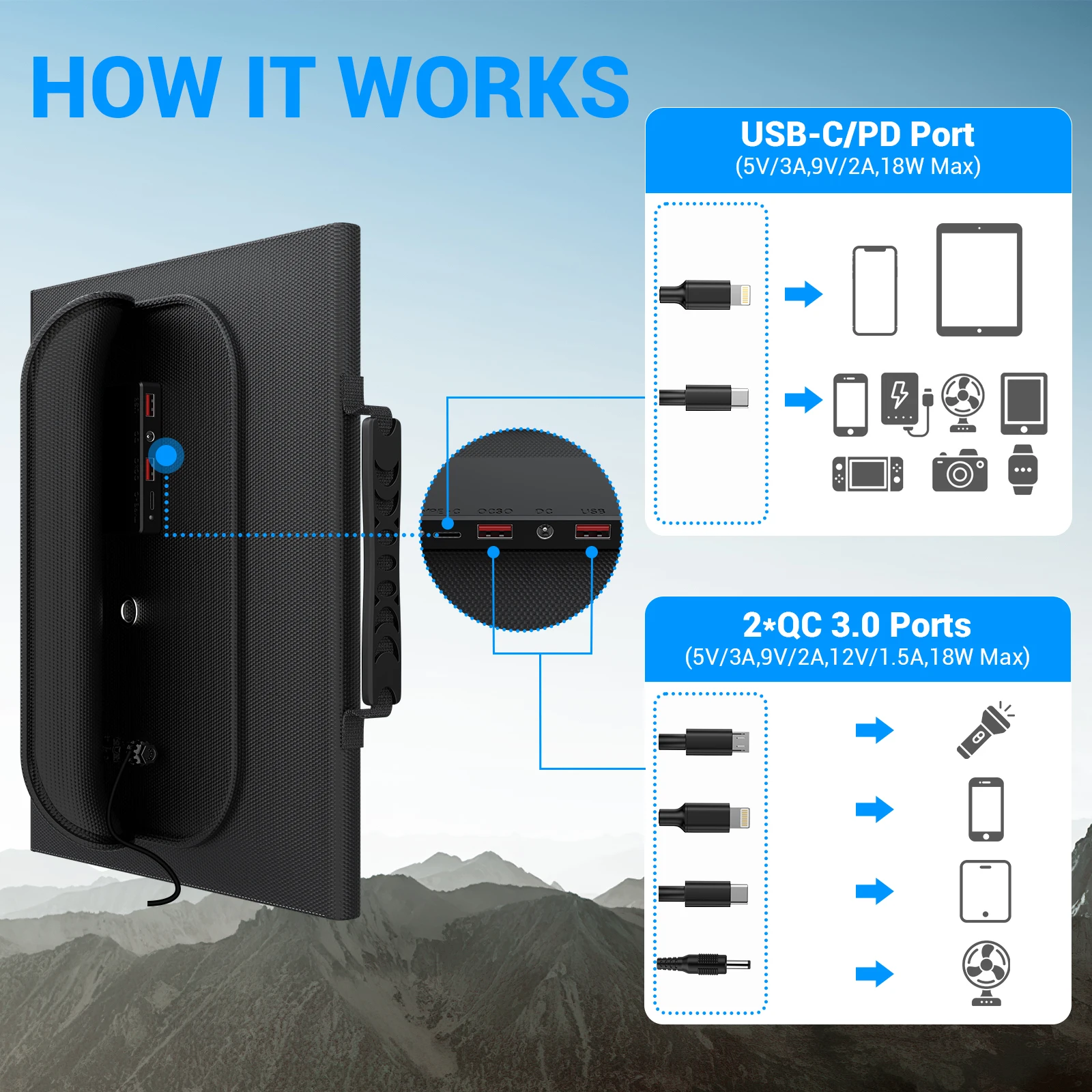This 30W travel-ready solar charger is designed for reliable power generation wherever you go. Featuring a foldable and lightweight design, it is easy to pack for camping, hiking, RV trips, and outdoor travel. The solar panel delivers efficient 18V output via MC4 connectors for compatible power stations. Dual USB-A ports with QC3.0 support fast charging for smartphones and small devices. The USB-C port with PD 18W provides stable and efficient charging for modern devices. Built with durable materials, it performs well in outdoor environments. Simple plug-and-play functionality allows convenient charging using sunlight. This portable solar charger is an ideal eco-friendly power solution for travel, emergencies, and off-grid use.