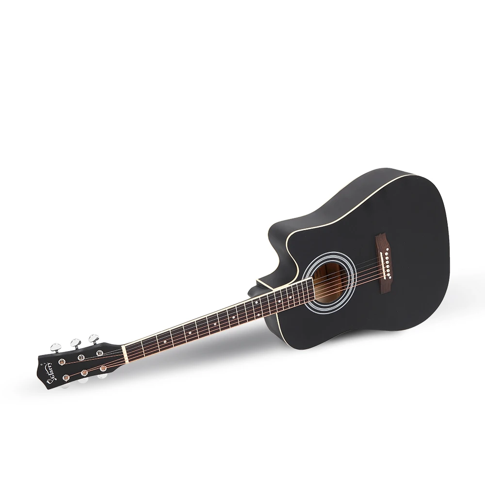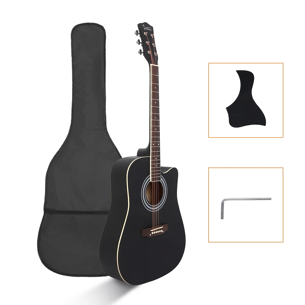This 41-inch folk acoustic guitar features a spruce panel top that delivers bright tone, clear highs, and balanced resonance. The notch-style headstock adds a modern touch while maintaining classic acoustic guitar character. A matte finish with clean edging provides a comfortable feel and reduces glare during practice or performance. Designed for smooth playability, it is suitable for beginners, students, and casual players. The full-size body produces strong projection, making it ideal for strumming, fingerpicking, and accompaniment. Durable construction ensures stable tuning and long-term use. The guitar comes complete with a protective bag for easy storage and transport. Included shield and wrench accessories help with basic maintenance and adjustments. Its sleek black color gives it a professional, timeless appearance suitable for home, school, or stage use.