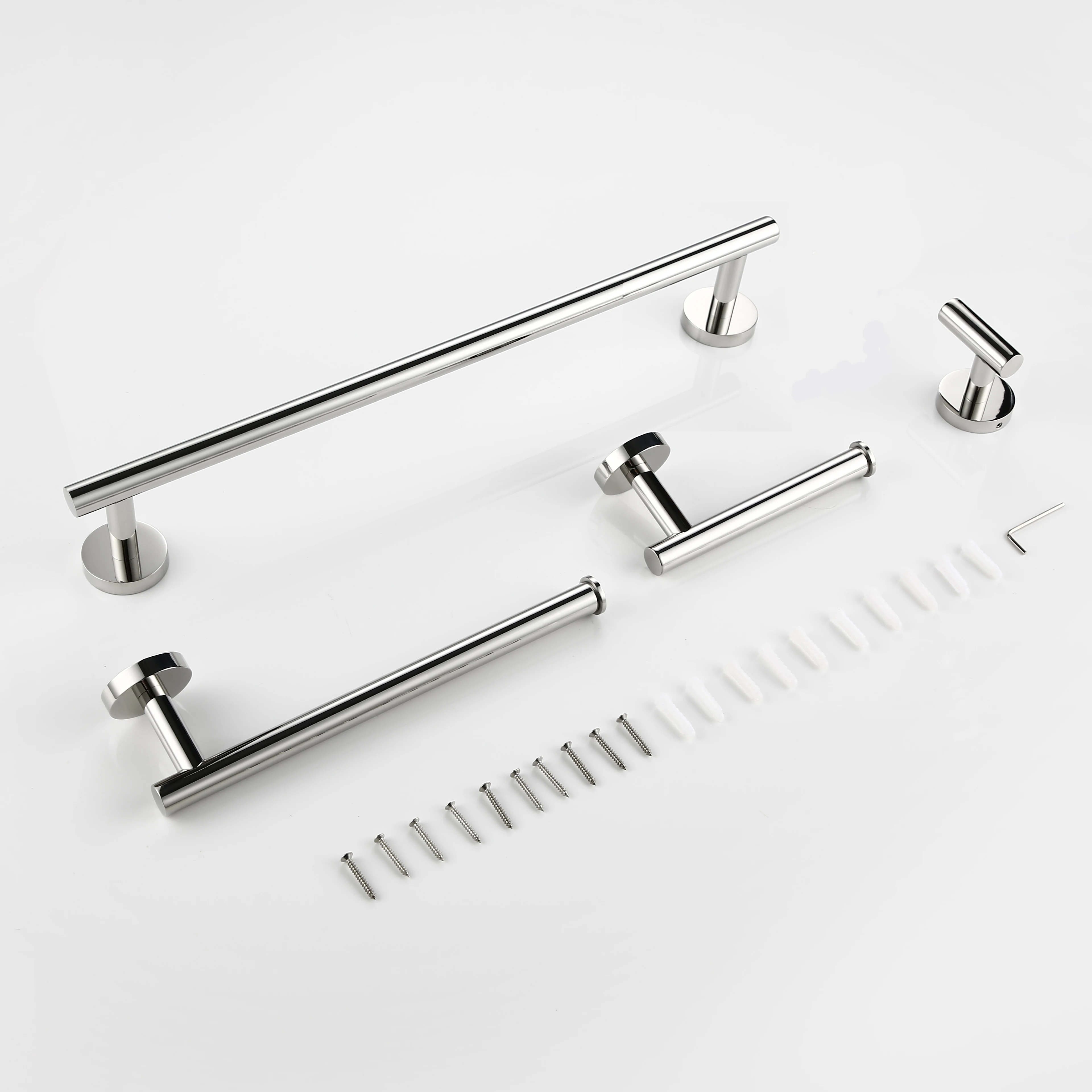 This wall-mounted bathroom accessories kit provides a sleek and functional upgrade for any modern bathroom. Made from durable stainless steel, each piece is built to resist rust, corrosion, and daily wear. The set includes a hand towel bar, toilet paper holder, and robe hooks, giving you everything needed to organize essentials neatly. Its round base design adds a stylish and contemporary touch suitable for chrome, black, or gold décor themes. Installation is simple and secure, ensuring the accessories remain firmly in place over time. The smooth, polished surfaces are easy to clean and maintain, helping your bathroom look fresh and elegant. Ideal for both small and large bathrooms, this set maximizes space while keeping items within easy reach. Whether for a home renovation or a new build, this accessory kit delivers convenience, durability, and modern style in one complete package.