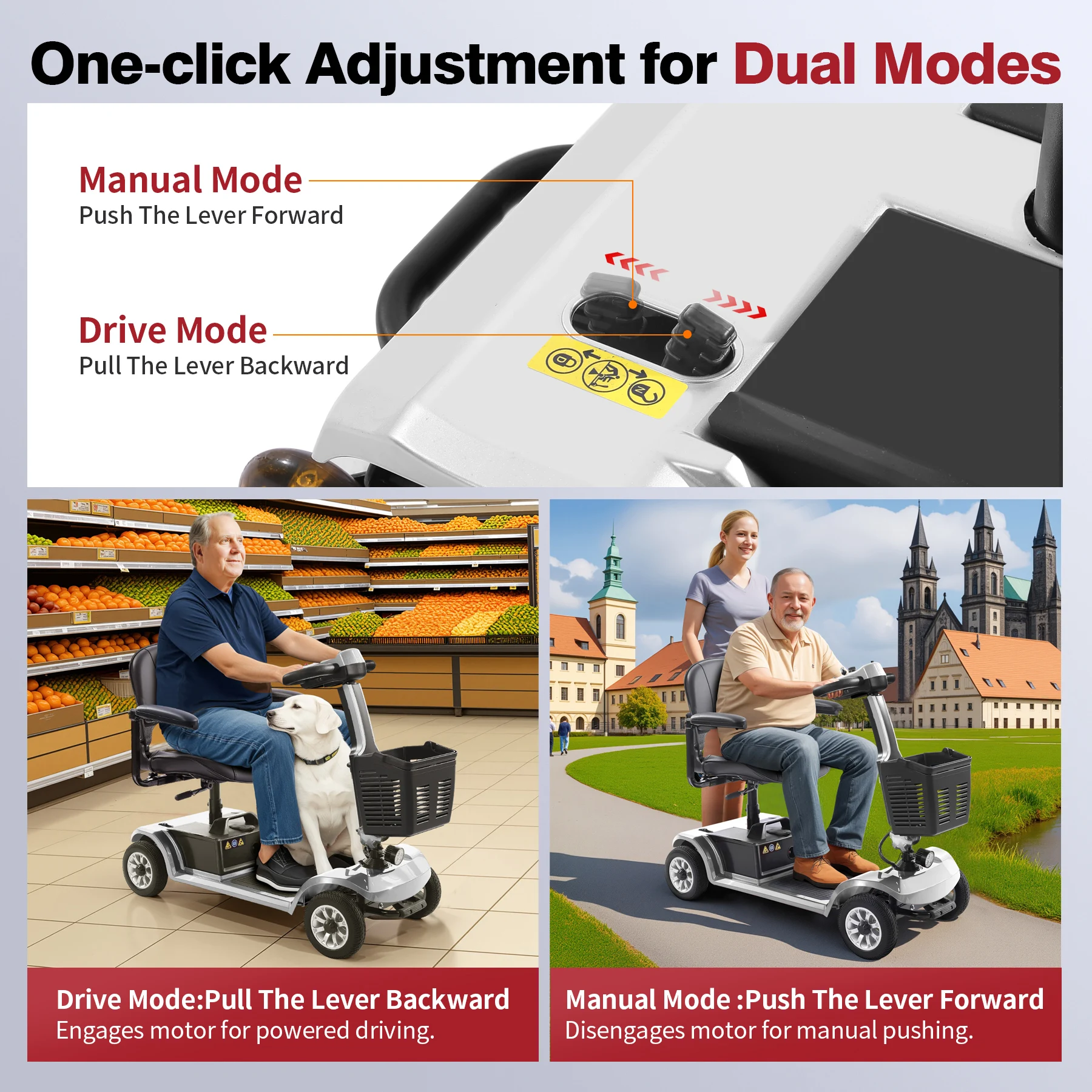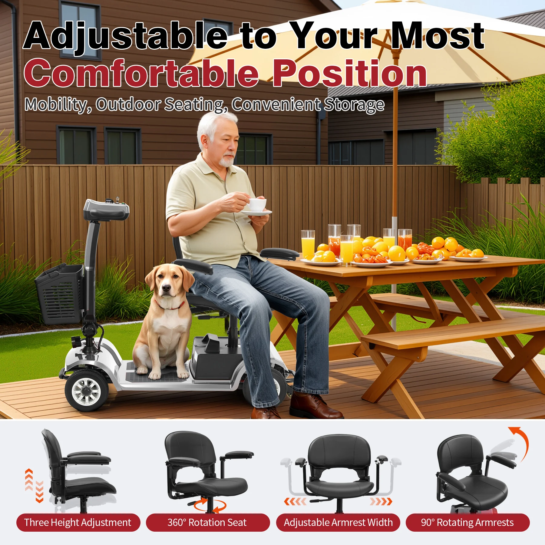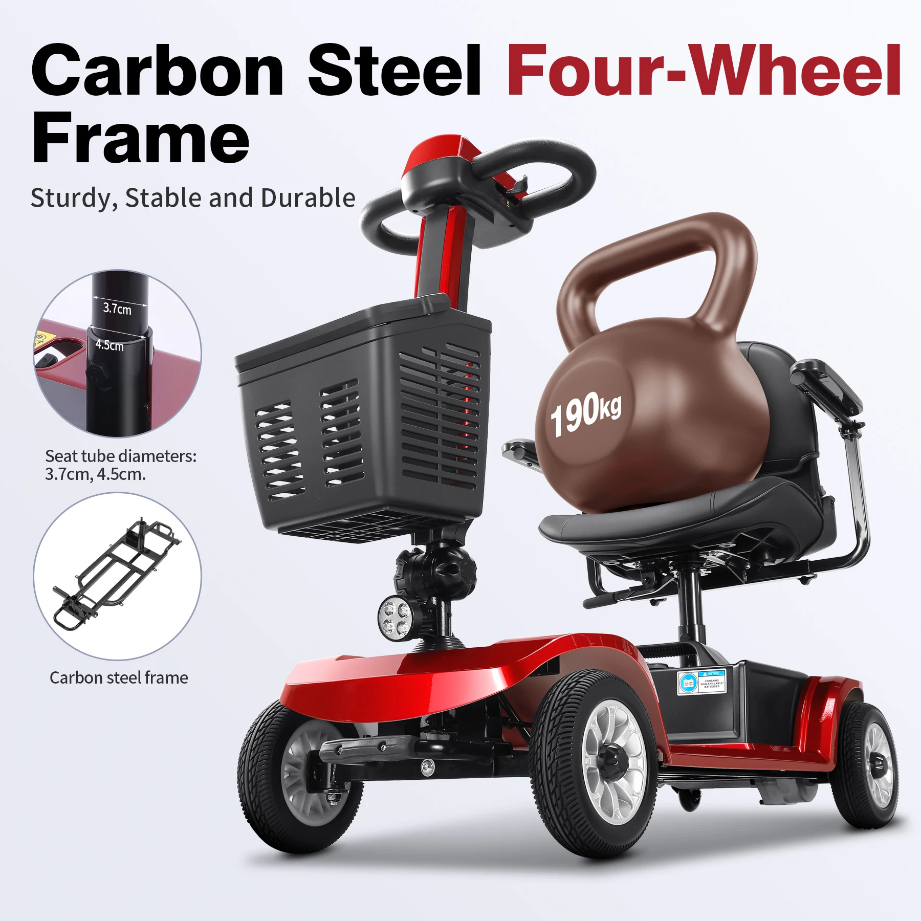This compact heavy-duty 4-wheel electric mobility scooter is designed for reliable travel and daily use by adults and elderly users. Equipped with a powerful 20AH battery, it delivers dependable performance and extended riding time. The four-wheel design provides enhanced stability and safety on various indoor and outdoor surfaces. Its compact frame makes it easy to maneuver in tight spaces while still offering strong support. The scooter is suitable for travel, errands, and everyday mobility assistance. Comfortable seating ensures a smooth and enjoyable riding experience. User-friendly controls allow simple operation for all skill levels. Available in stylish red and gray color options, it combines practicality with modern design. This powered mobility scooter helps improve independence, comfort, and confidence in daily life.