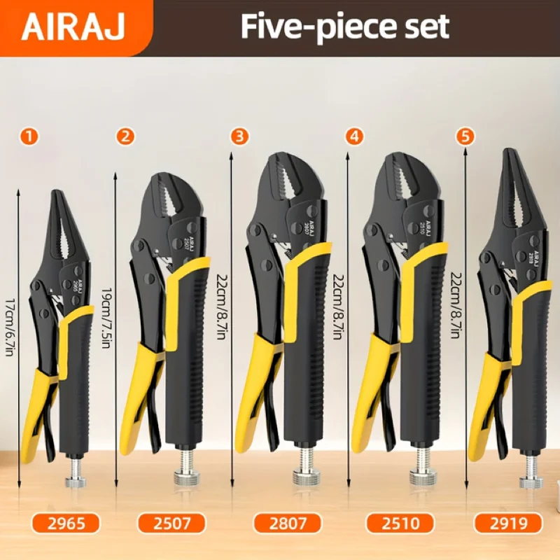 This 5-piece locking pliers set is designed for strong and reliable clamping in a wide range of tasks. Each plier features a curved jaw design that grips securely onto bolts, pipes, metal sheets, and irregular shapes. The quick-release mechanism allows for easy one-hand operation and rapid adjustments. Made from durable, high-strength steel, these pliers provide excellent resistance to pressure and wear. They are ideal for twisting, bending, tightening, and holding components firmly in place. The ergonomic handles help reduce hand fatigue during extended use. This set is suitable for mechanics, DIY users, and metalworking professionals. Whether you’re clamping parts for welding or holding hardware steady, the performance remains consistent. The variety of sizes ensures you always have the right tool for the job. Overall, it’s a versatile and dependable plier set built for precision and power.