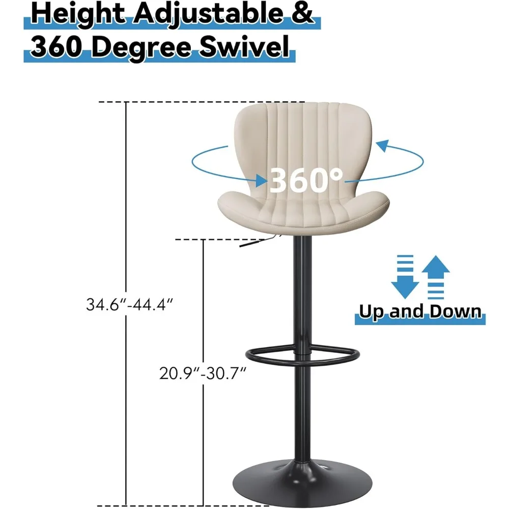 This set of four modern bar stools offers stylish and comfortable seating for kitchen counters and dining spaces. The swivel design allows smooth 360-degree rotation for easy movement and convenience. Upholstered in faux leather, the seats provide a soft, comfortable feel while being easy to maintain. Each stool features a supportive backrest to enhance comfort during meals or gatherings. The sturdy metal frame ensures durability and long-lasting stability. A built-in footrest adds extra support and relaxation while seated. These bar stools are ideal for kitchens, home bars, and dining areas with a contemporary aesthetic.