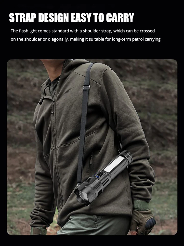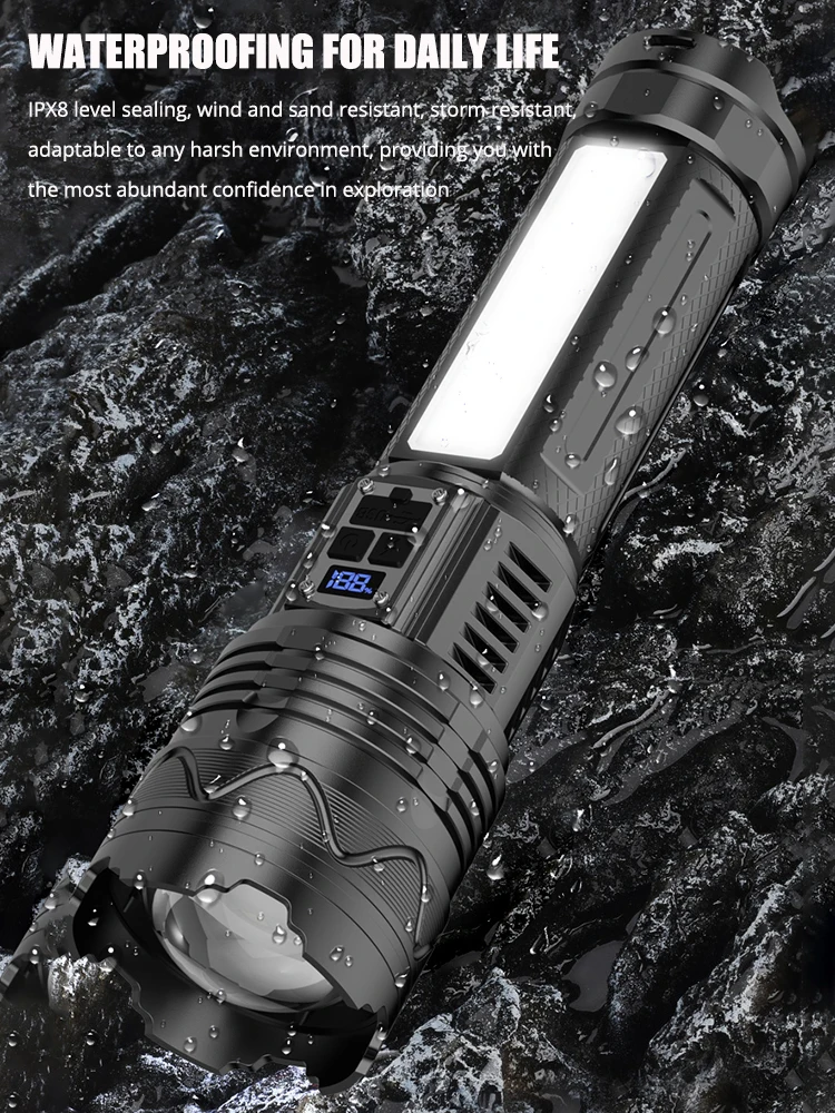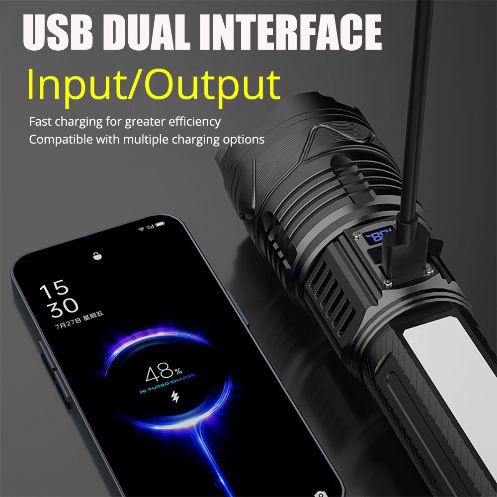 This high-power rechargeable LED flashlight delivers extremely bright illumination for outdoor, work, and emergency use. Equipped with a built-in 15000mAh battery, it provides long-lasting runtime and reliable performance. The ultra-bright LED design offers wide-area lighting and long-distance visibility in dark environments. It can be used as both a tactical torch and a lantern, making it versatile for different scenarios. USB rechargeable functionality allows convenient charging from power banks, cars, or wall adapters. Durable construction ensures dependable use during camping, hiking, and outdoor activities. Multiple lighting modes help adapt to various needs and situations. This flashlight is a powerful and practical lighting solution for home, travel, and emergency preparedness.