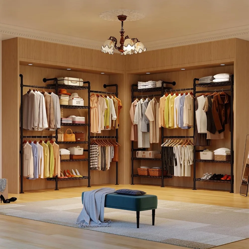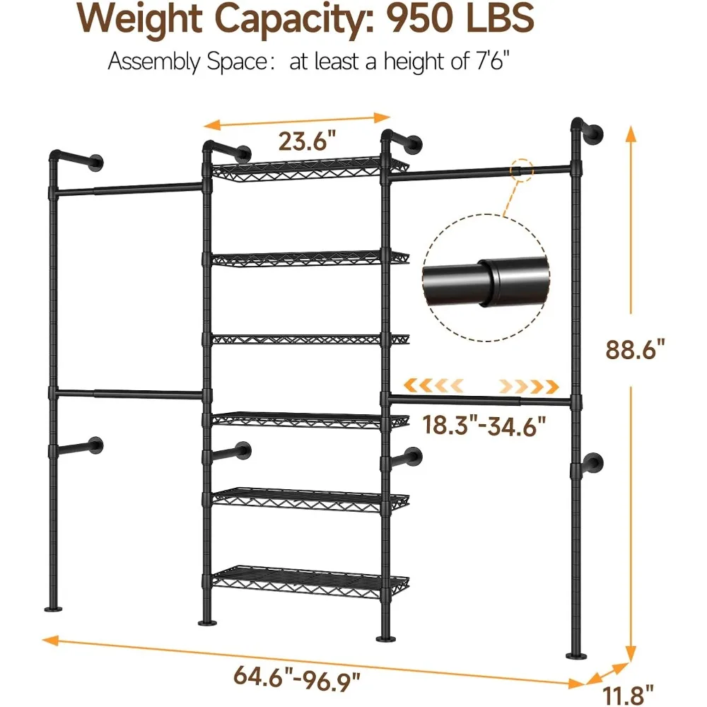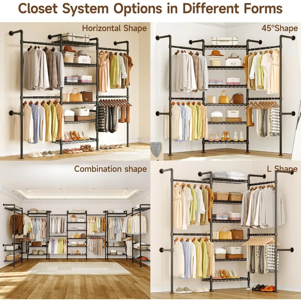 This wall mounted closet system features a heavy duty industrial pipe design for reliable clothing storage. The expandable structure allows flexible adjustment to fit different wall spaces and storage needs. Designed for hanging clothes, it provides strong support for coats, jackets, shirts, and garments. The wall-mounted installation helps save floor space while keeping clothing neatly organized. Built with sturdy materials, it is suitable for long-term everyday use. Ideal for bedrooms, walk-in closets, laundry rooms, or retail displays. This closet organizer combines industrial style with practical functionality for modern storage solutions.
